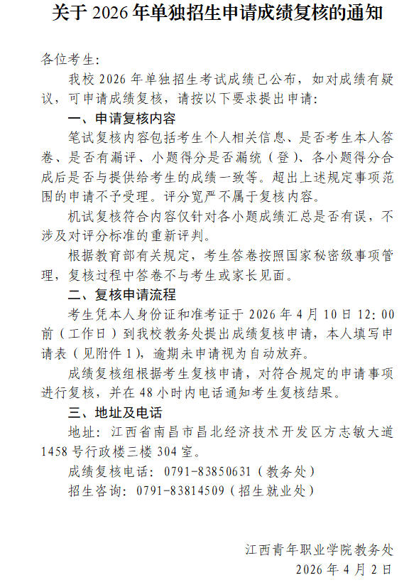 江西青年职业学院2026年单独招生考试
